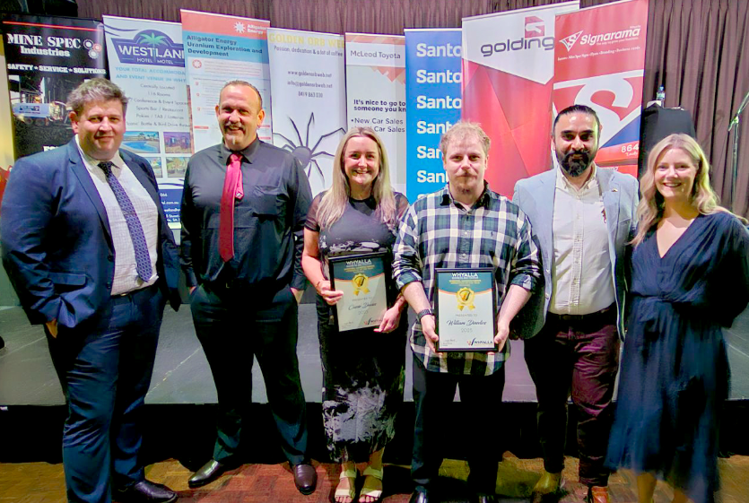 Pictures – Main picture and top right: Apprentice training is complemented with TAFE SA courses. Above right: Whyalla apprentices celebrate award recognition at the Mine Spec Whyalla Business & Tourism awards, from left, Whyalla Iron Ore General Manager Jared Fechner, Chris Reeves 3rd year apprentice fitter, Cassie Davies 4th year electrical, William Dinedios 4th year fitter, Whyalla Steelworks General Manager Amrit Mangat and General Manager Supply Train Hayley Perkins.